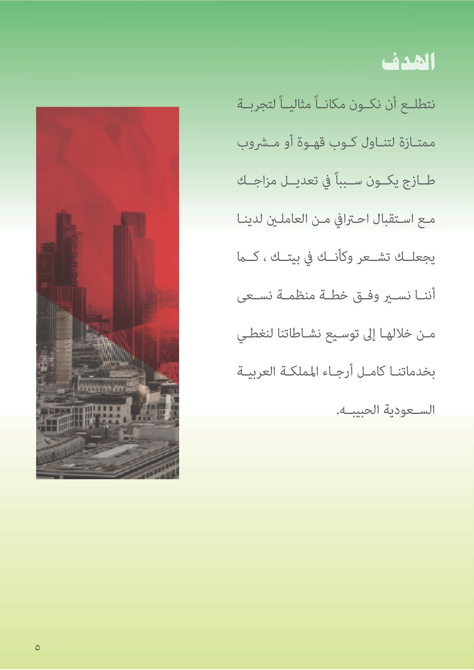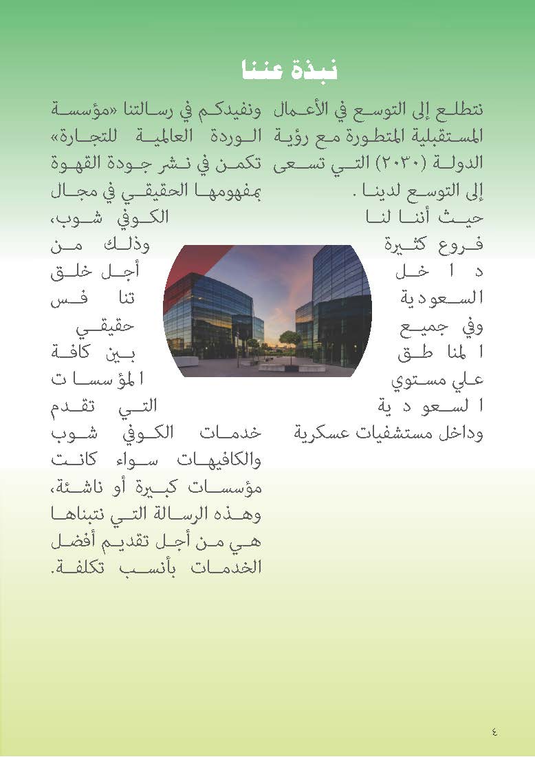 معاً نتمتع بأفضل بوفيهات الكافيتريات تذوق النكهات اللذيذة في الوردة العالمية نتطلع إلى التوسع في الأعمال المستقبلية المتطورة مع رؤية الدولة ((2030)) التي تسعى إلى التوسع لدينا . حيث أننا لنا فروع كثيرة داخل المملكة العربية السعودية وفي جميع المناطق علي مستوي المملكة العربية السعودية وداخل مستشفيات عسكرية .ونفيدكم نحن ((مؤسسة الوردة العالمية للتجارة)) تكمن في نشر جودة القهوة بمفهومها الحقيقي في مجال الكوفي شوب وذلك من أجل خلق تنافس حقيقي بين كافة المؤسسات التي تقدم خدمات الكوفي شوب والكافيهات سواء كانت مؤسسات كبيرة أو ناشئة وهذه الرسالة التي نتبناها هي من أجل تقديم أفضل الخدمات بأنسب تكلفة .